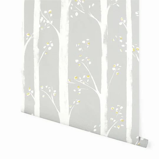 Decorated with simple woodland trees complete with pops of ochre coloured leaves, this wallpaper is suitable for most living areas, this paper can be used throughout a whole room or for a feature wall. The beautiful wallpaper features a clean grey background on a flat surfaced paper to make this design feel modern, suitable for any home.